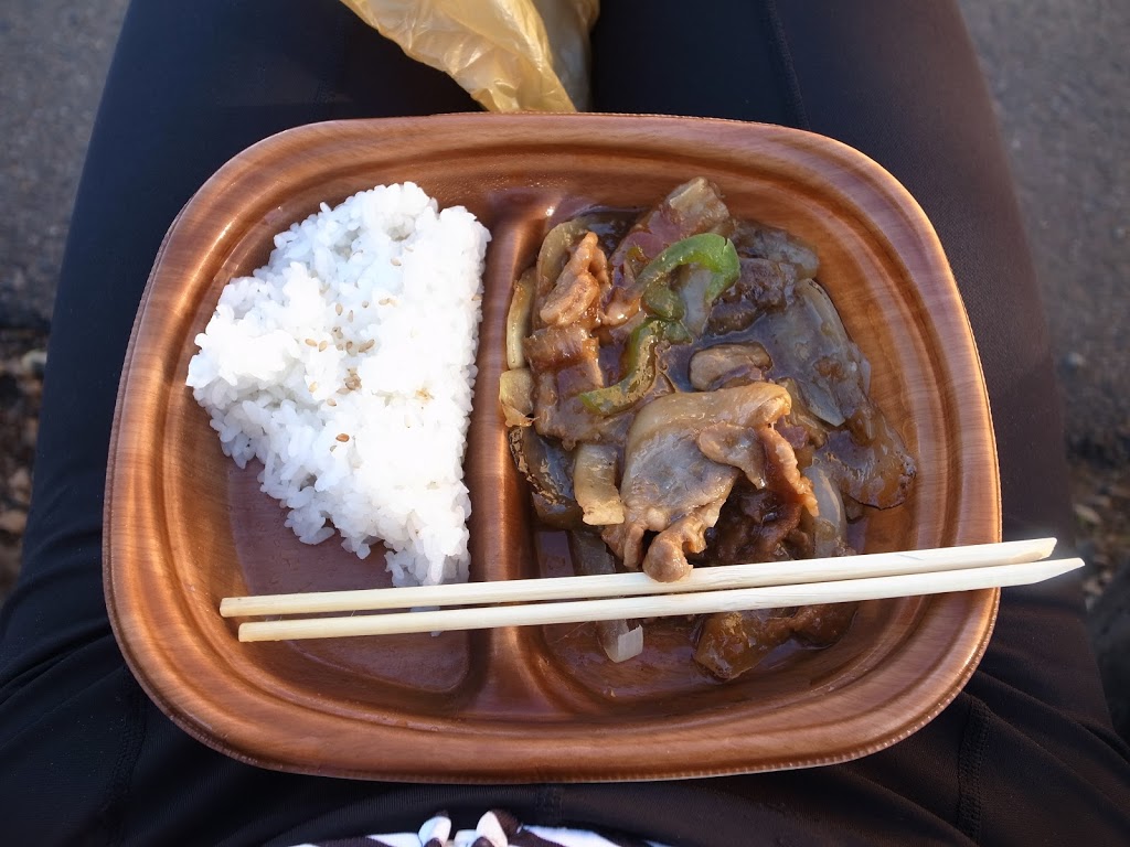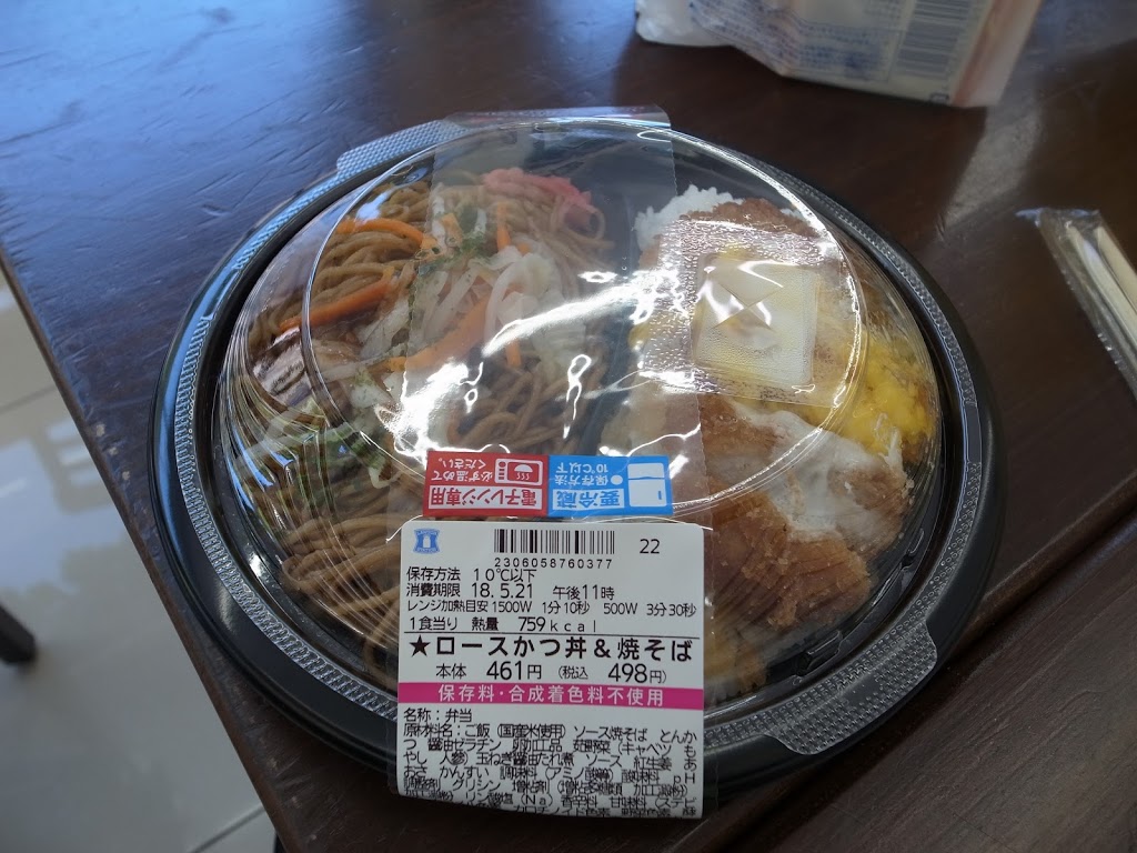予定通り5時30分に出発し、数km先のコンビニでまずは朝食。食べかけてから写真を撮るパターン。
