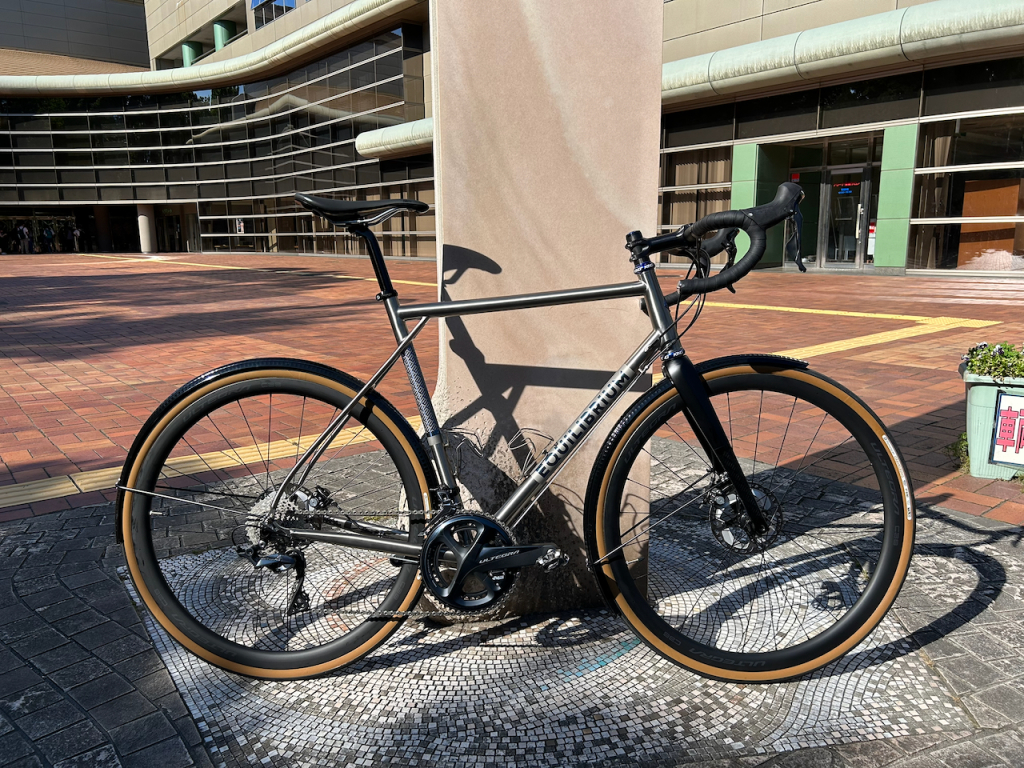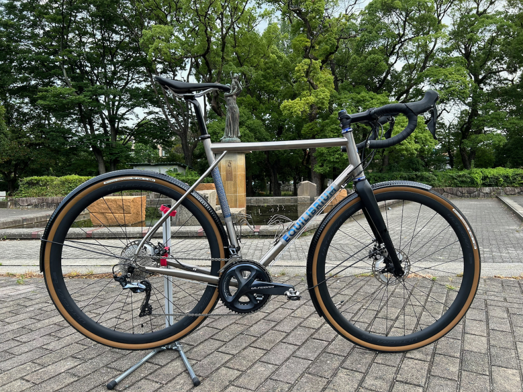 EquilibriumのグラベルモデルのBrutalistをベースにしたオールロードバイクです。デザインなどは大まかにリクエストをしたけど、Equilibriumのお二人にお任せした方がいい感じになるだろうと思って細部は完全にお任せ。思っていた以上にいい感じです。かっちょいい。