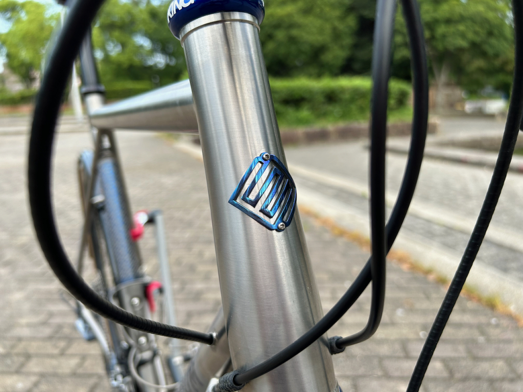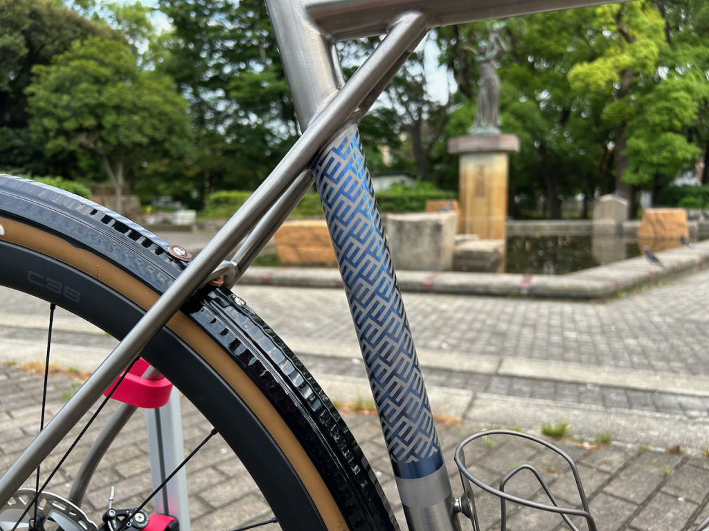 デザインはEQのお二人に任せた方がよかろうと思い、ほぼお任せ。最初はパナチタンから趣向を変えて、シートポストやステムをシルバーにしてもいいかなと思っていたけど、自分のようなでかいフレームだと黒の方が締まって見えるはずというお二人の意見もあって黒で統一。色は青基調でということをお願いしたけど、デザインに関して細かい注文は何もしていない。フォークも本来は先端にColumbusのロゴがあるやつだが、EQマークで上書きされていた。自分が思っていたより断然いい感じに仕上がっているので、やはりこういうものはセンスのある方々に任せた方がよい。