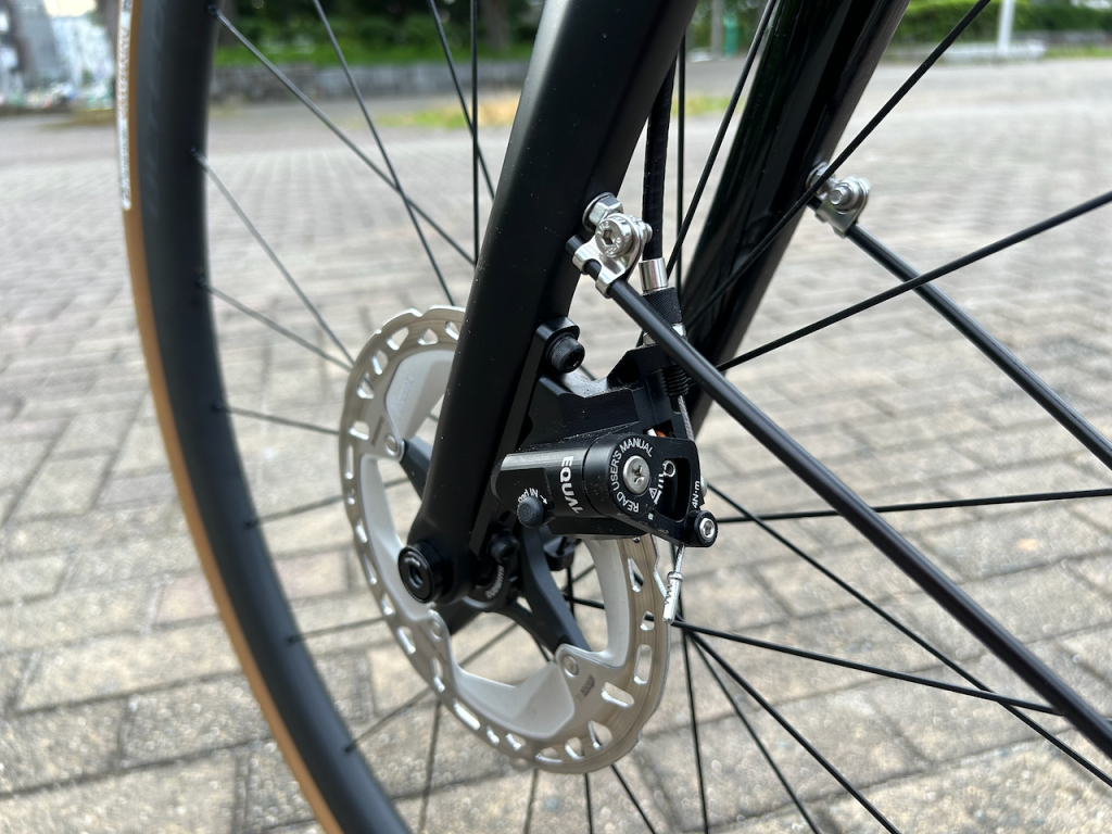 ブレーキはEQUAL。ちょうどパーツ発注のタイミングで新色のブラックが発売になったので黒にした。元々あったグレーよりも今回のフレームに合う色でタイミングがよかった。手がデカくて握力もあるのでリムブレーキでも全然制動力に不満を感じたことはないが、リムブレーキに投資する時代でもない。プロの世界でエアロ化が進む以上剛性が高くなったフレームをどこで中和させるのかというとタイヤになるし、太いタイヤを入れるにはディスクブレーキシステムに頼るしかない。